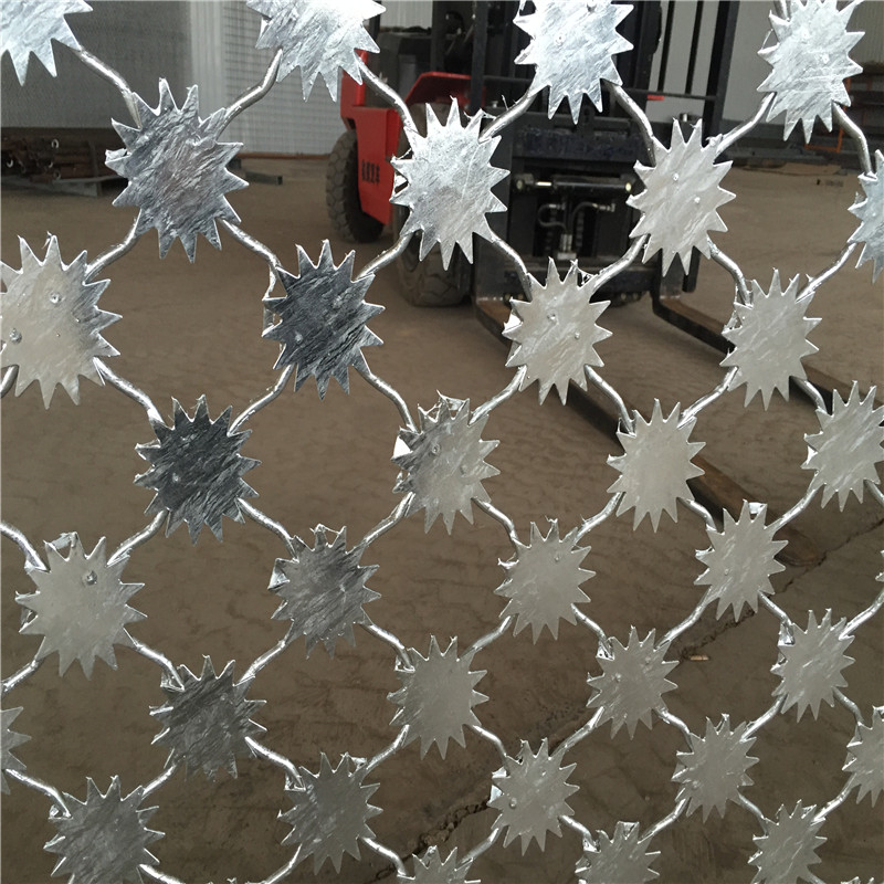 (2)網(wǎng)片采用Q235低碳鋼板沖壓成型,為梅花刺防沖隔離網(wǎng),單網(wǎng)幅度為2500mm*4000mm(含網(wǎng)片耳朵尺寸),使用邊框為30*50*2.5m方管,絲徑為5.5㎜,網(wǎng)孔邊到邊為9cm,刺片直徑不小于7cm,厚度為1.2mm,,將網(wǎng)絲、方管焊為一體;邊框與立柱采用螺栓固定邊耳式連接,邊耳均為40*40*4mm扁鐵,邊耳螺孔可調(diào),調(diào)節(jié)距離不小于20mm;邊耳固定螺栓為¢8mm×25mm304不銹鋼螺栓,304不銹鋼安全螺栓、螺母,每片網(wǎng)單邊連接點為6個以上,每網(wǎng)片框增加一道方管(30*50*2.5㎜熱鍍鋅方管)垂直中稱。
