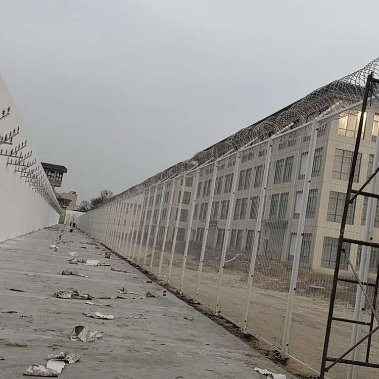 工程案例它主要是采用高強度的刀片刺繩與邊框防護網(wǎng)的結(jié)合,由V型支架立拄,加強型焊接片網(wǎng),安全防盜連接件和刀片刺繩組成.刀片刺繩是一種新型防護網(wǎng),由銳利尖角鍍鋅鋼板或不銹鋼薄板做刀片,鋼絲做芯線組合而成的防護器材. 監(jiān)獄鋼網(wǎng)墻刀片刺繩具有嚇阻、防翻越等效果,材質(zhì)堅硬,高強度,高張力,造型設(shè)計獨特,不宜觸摸,因而能達到極好的防護隔離效果.監(jiān)獄鋼網(wǎng)墻還具有施工簡便,經(jīng)濟實用等優(yōu)點.
