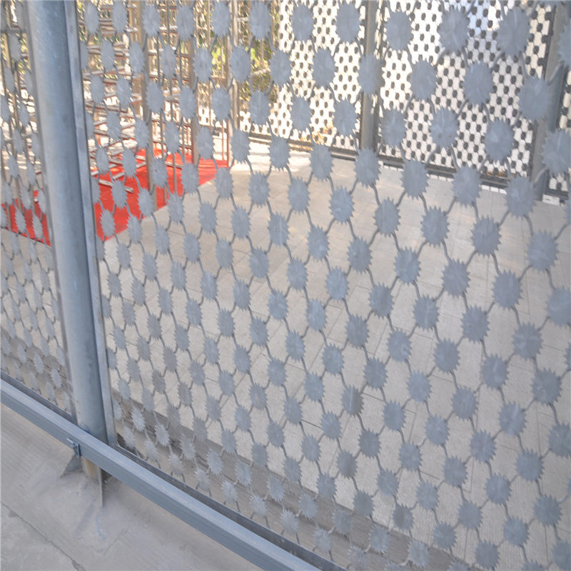 太陽花鋼網(wǎng)墻又稱梅花刺鋼網(wǎng)墻,此種產(chǎn)品一改往常鋼網(wǎng)墻長方形的網(wǎng)孔形式,采用菱形孔的美格網(wǎng)網(wǎng)片,在網(wǎng)片的每個(gè)截點(diǎn)焊接梅花形刺片,因其特殊的外形,相較于之前的普通鋼網(wǎng)墻,無法采取腳踩、手握的方式翻越,防攀爬性能、安全性能有所增強(qiáng)。