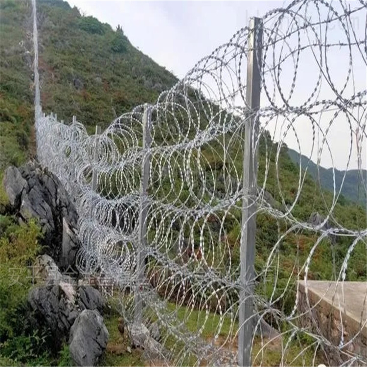 工程案例邊防警戒線圍欄網(wǎng),防攀爬隔離網(wǎng),監(jiān)獄刀片刺網(wǎng)隔離網(wǎng),梅花刺隔離網(wǎng)主要用于監(jiān)獄、看守所、戒毒所、哨所、邊防等的圈禁防護。梅花刺隔離網(wǎng)由美格網(wǎng)和梅花刺片(因其外形類似梅花得名)組合而成的阻絕器材。由于梅花刺隔離網(wǎng)造形獨特不易觸摸,因而能達到很好的防護隔離效果。既美觀又讓人不寒而粟。起到了很好的阻嚇作用。