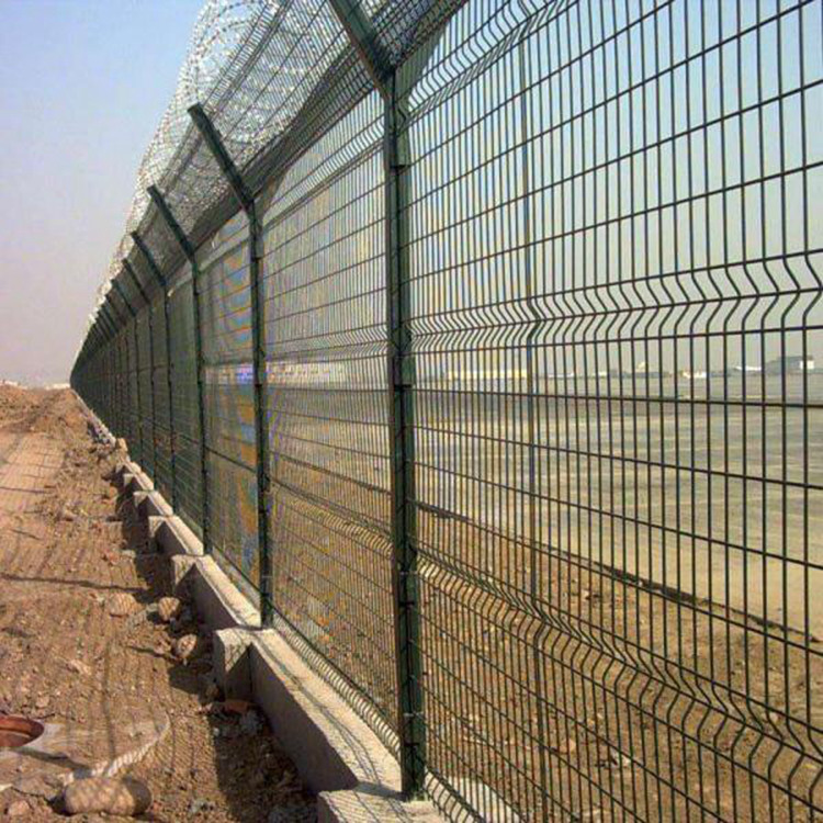 工程案例機(jī)場(chǎng)圍界圍欄網(wǎng)一般頂端都設(shè)有V型支架與立柱焊接。材料通常選擇和立柱同等材料或者稍小規(guī)格材料搭配使用。V型支架的加裝是為了將蛇腹形刀刺網(wǎng)固定在圍界網(wǎng)頂部,從而有效的增加機(jī)場(chǎng)圍界網(wǎng)的防攀爬性和安全性。