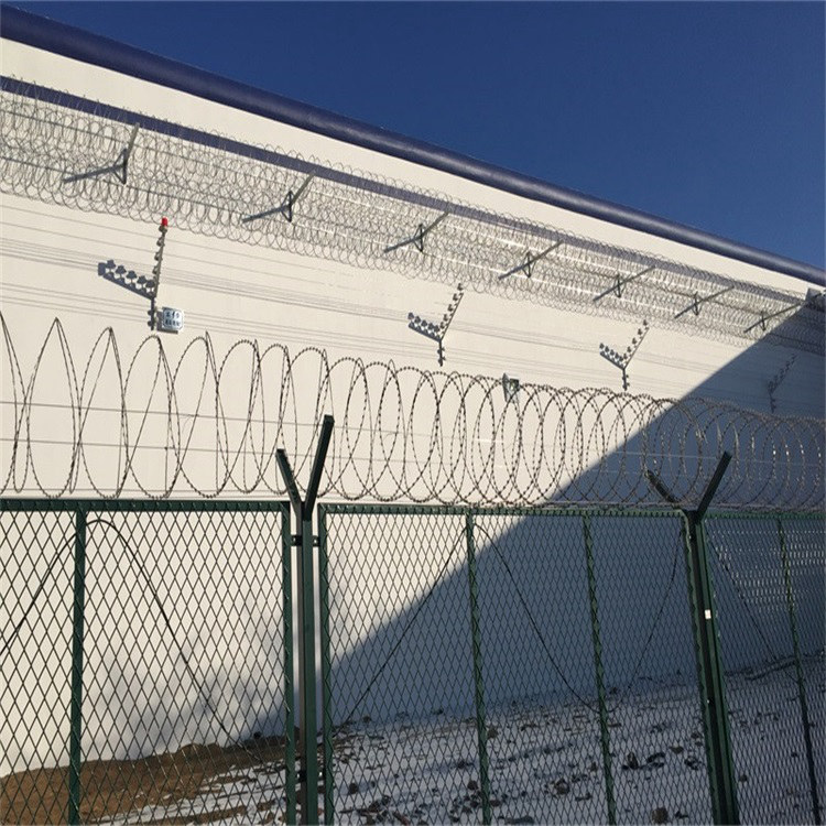工程案例監(jiān)獄鋼網(wǎng)墻又稱作“Y型安全防御護(hù)網(wǎng)”,是由V型支架立柱加強(qiáng)型焊接片網(wǎng),安全防盜連接件和熱鍍鋅刀片刺網(wǎng)組成強(qiáng)度和安全防御性級(jí)別很高。被廣泛應(yīng)用在監(jiān)獄,軍事基地等高安全場(chǎng)所。