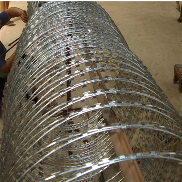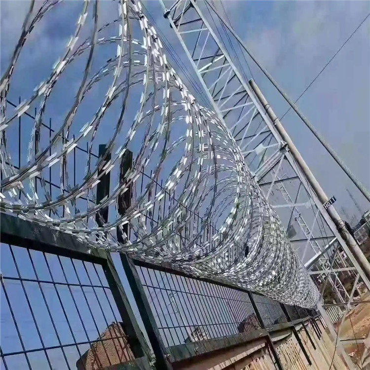 工程案例普通的圍墻經(jīng)常會有人或動物翻越的危險,所以在安全防御方面,就應生了刀刺網(wǎng)這種產(chǎn)品,南方人喜歡叫刺絲滾籠,北方人喜歡叫刀刺網(wǎng),也有很多其他叫法,如:蛇腹形(型)刀刺網(wǎng) 滾刀刺,刺刀圈,那它有很多種型號,常用的就是BTO-22刀刺網(wǎng),材質(zhì):熱浸鋅和不銹鋼,型號:BTO-22,芯線:常用2.5mm,厚度:0.5mm,刀片長度:22mm*15mm,刀片間距:34mm。直徑300-1000mm,常用的是500mm的。如果是陰雨多的地方建議選擇不銹鋼刀刺網(wǎng)材質(zhì),其他地方熱浸鋅的就可以。刀刺網(wǎng)安裝在圍墻上通常搭配支架來安裝固定,每3米設置一個支架,由刺絲連接卡扣與固定在支架上的縱向拉筋相連接,縱向拉筋與支架的連接采用?2.5mm的冷拔鍍鋅鋼絲繞2圈后擰緊固定,支架底盤用膨脹螺絲固定在圍墻上就可以了。