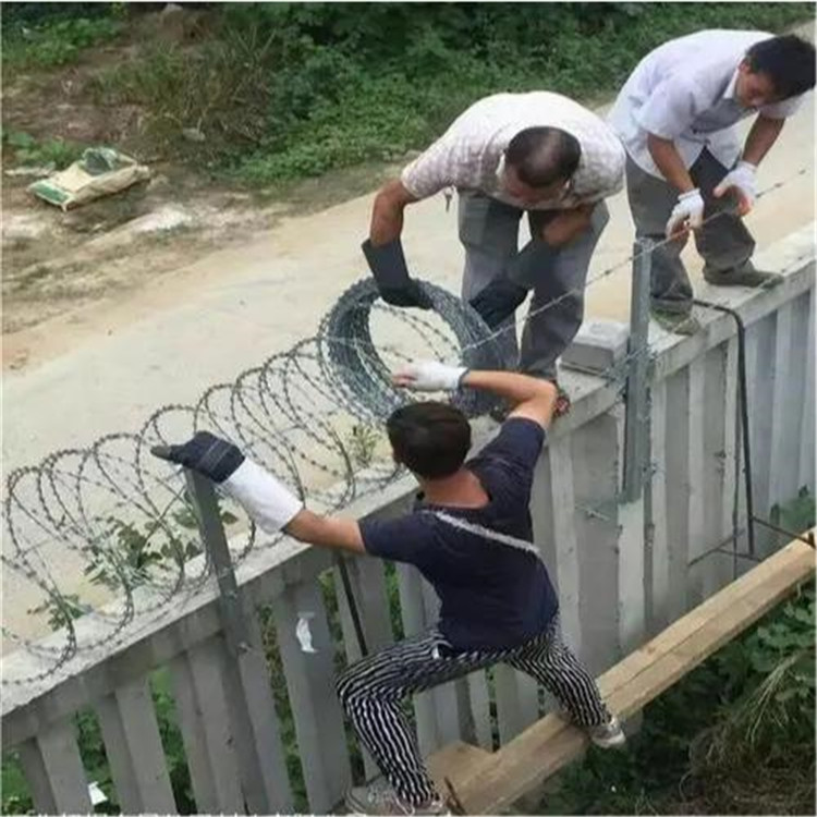 工程案例在鐵路上因為鐵路沿線都比較長所以都會用一下比較廉價的水泥墻來作為圍墻,但是也因為水泥墻的厚重,所以做的都不會很高還是會有人或動物翻越的危險。所以在安全防御方面,就應生了刀刺網(wǎng)這種產(chǎn)品,南方人喜歡叫刺絲滾籠,北方人喜歡叫刀刺網(wǎng),也有很多其他叫法,如:蛇腹形(型)刀刺網(wǎng) 滾刀刺,刺刀圈,那它有很多種型號,用在鐵路刺絲滾籠常用的材質(zhì):熱浸鋅和不銹鋼,型號:BTO-22,芯線:常用2.5mm,厚度:0.5mm,刀片長度:22mm,寬度:15mm,刀片間距:34mm,圈徑500mm,如果是陰雨多的地方建議選擇不銹鋼刀刺網(wǎng)材質(zhì),其他地方熱浸鋅的就可以。另外關于安裝密度問題,我們一般都是按照鐵路相關文件要求,一米不低于10圈的安裝標準來核算成本,如果允許調(diào)整密度,則價格也會隨之變動。