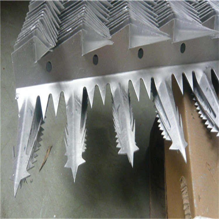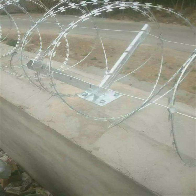 工程案例刀刺網(wǎng)支架,圍墻刀片刺網(wǎng)V型支架采用50*50mm方管做支架,方管上焊有與拉絲連接的L型鐵鉤,底座與圍墻連接采用200*200mm鋼板,大大的增強(qiáng)了支架與墻體的牢固度。V型支架里外均采用熱浸鋅處理,使支架的防腐壽命更長(zhǎng)。支架的安裝應(yīng)分段進(jìn)行:先安裝兩端的支架,然后拉線(xiàn)埋設(shè)中間的立柱。控制支架與中間支架的平面投影在一條直線(xiàn)上,不得出現(xiàn)參差不齊的現(xiàn)象。刀刺網(wǎng)支架在圍墻上的固定方法一般為底盤(pán)打膨脹螺絲固定。固定好后,方可進(jìn)行蛇腹形刀刺網(wǎng)安裝。安裝好支架立柱了,先把要安裝刀片刺繩的拉絲給固定上,然后利用拉絲的支撐力來(lái)安裝刀片刺繩,并用專(zhuān)用的卡扣、卡鉗進(jìn)行固定。