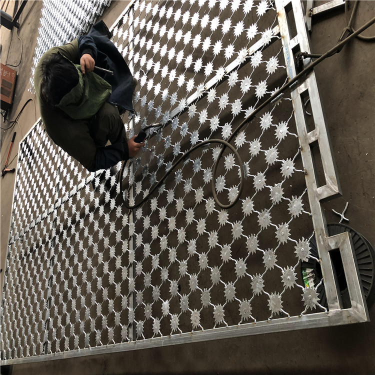 監(jiān)獄梅花刺片隔離網(wǎng)一改往常鋼網(wǎng)墻長(zhǎng)方形的網(wǎng)孔形式,采用菱形孔的美格網(wǎng)網(wǎng)片,在網(wǎng)片的每個(gè)截點(diǎn)焊接梅花形刺片,因其特珠的外形,相較于之前的普通鋼網(wǎng)墻,無(wú)法采取腳踩、手握的方式翻越,防攀吧性能、安全性能有所增加。表面處理多采取熱鍍鋅的形式,也有要求較高的地方采用不銹鋼材質(zhì)的鋼網(wǎng)墻,防腐蝕效果更佳。故而已被越來(lái)越多的監(jiān)獄、看守所、邊防線等單位使用。