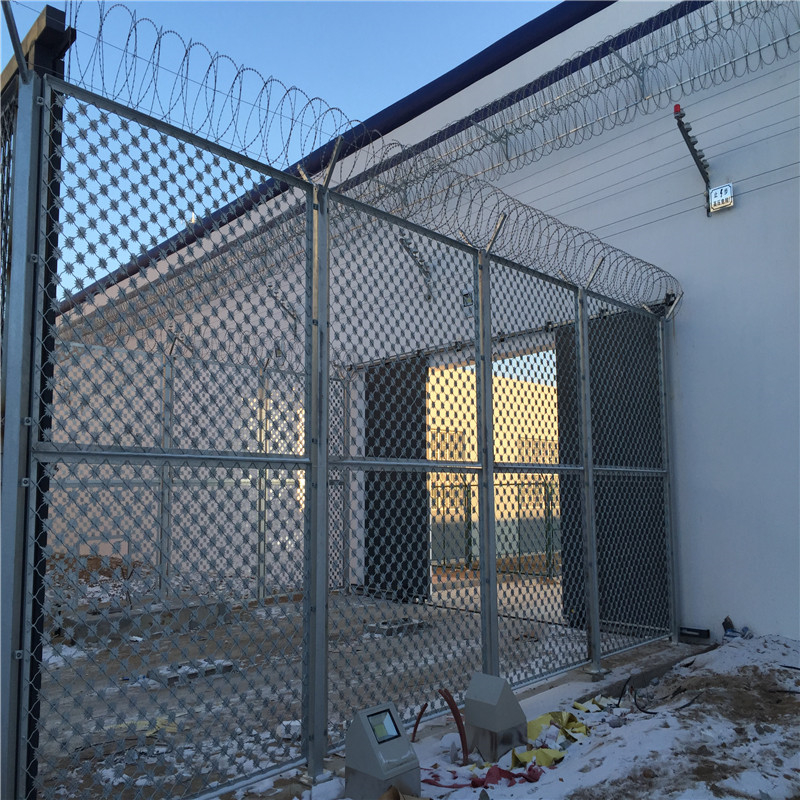 監(jiān)獄焊接鐵絲網(wǎng) 看守所防護(hù)網(wǎng) 看守所防爬網(wǎng),監(jiān)獄鋼絲焊接的網(wǎng)片采用低碳鋼絲焊接而成,表面采用pvc浸塑處理,與刀刺網(wǎng)連接。安裝刀刺網(wǎng)的立柱采用6CM*6CM方管,壁厚在2-2.5MM,高2.4米,底部2米圍直線,上部0.4米向內(nèi)折30度成斜線,立柱間隔為3米;橫梁采用4CM*2CM長方鋼,長3米為一個(gè)單位:立柱和橫梁表面涂黑綠色(注塑工藝),橫梁和立柱配有連接件。