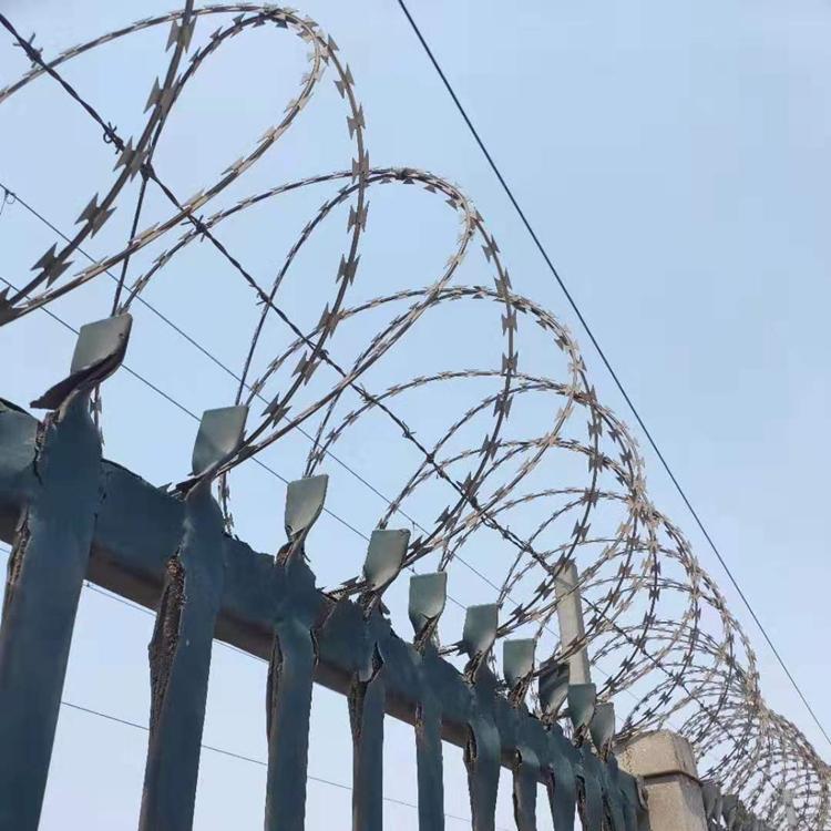 也就是簡略的一部了,把用鐵絲串接在一起的刀片刺網(wǎng),擺開固定就行了。有時候為了防護效果更強,會在Y 型支柱的支架上各加上一條直線型的刀片刺繩。既漂亮又防護強!