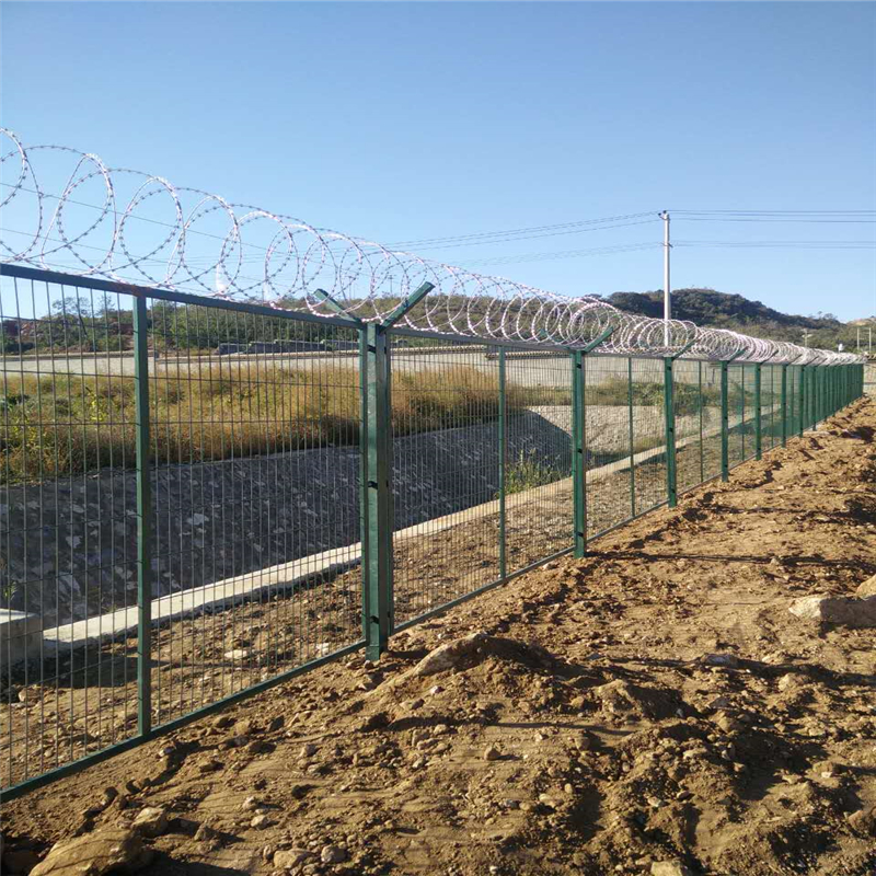 主要是采用高強(qiáng)度的刀片刺網(wǎng)與普通防護(hù)網(wǎng)的結(jié)合,由V型支架立拄,加強(qiáng)型焊接片網(wǎng),安全防盜連接件和刀片刺網(wǎng)組成.刀片刺網(wǎng)是一種新型防護(hù)網(wǎng),由銳利尖角鍍鋅鋼板或不銹鋼薄板做刀片,鋼絲做芯線組合而成的防護(hù)器材.