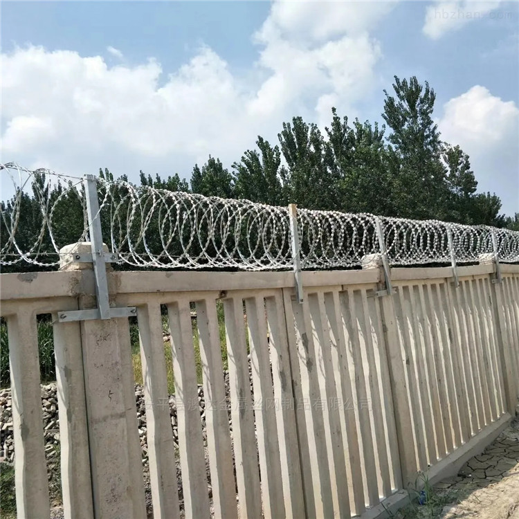 鐵路刺絲滾籠防護柵欄主要包括刀片剌網(wǎng),刺繩,和支架及卡扣等。安裝好后具有很好的阻嚇效果,與能起到相同作用的產(chǎn)品比起來性價比是高很多的。主要制作工藝就是由熱鍍鋅鋼板或者不銹鋼鋼板沖壓出尖銳的刀片,然后由高張力鍍鋅鋼絲或者不銹鋼絲來做芯線組合構(gòu)成的防護產(chǎn)品。配合立柱支架、加密支架、臺階支架安裝在水泥立柱上起到固定的作用,一般間隔3米安裝一個。