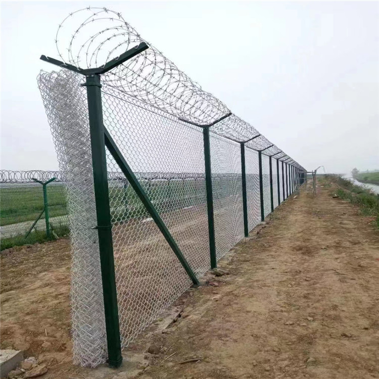 新聞動(dòng)態(tài) 鋁包鋼機(jī)場圍界主要用于機(jī)場外圍的防護(hù)使用,是一種新型機(jī)場圍界防護(hù)網(wǎng),又被稱作鋁包鋼機(jī)場圍欄。鋁包鋼絲機(jī)場護(hù)欄具有獨(dú)具匠心的鋼絞線穿插式連接立柱和網(wǎng)片,由Y型立柱、鋁包鋼勾花網(wǎng)、鋁包鋼刺絲網(wǎng)組成。 鋁包鋼機(jī)場圍界具有美觀實(shí)用、防腐性好、無需保養(yǎng)、防攀爬能力強(qiáng)、方便運(yùn)輸和安裝等特點(diǎn),關(guān)鍵的是鋁包鋼絲機(jī)場護(hù)欄可以使用30年以上,強(qiáng)度可達(dá)600Mpa。主要適用于機(jī)場周圍的隔離防護(hù),美化及防翻越工程,目前基本都是定制生產(chǎn)。