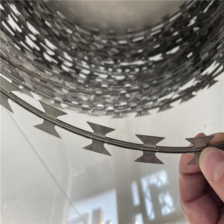 刀片刺網(wǎng)又名刮刀型刺絲,是一種近年發(fā)展起來(lái)的防護(hù)、隔離能力較強(qiáng)的新型防護(hù)網(wǎng)產(chǎn)品。鋒利的刀型刺由雙線扣裝后成蛇腹?fàn)?既美觀又讓人不寒而栗。起到了很好的阻嚇作用。同時(shí)該產(chǎn)品具有美觀、防阻效果好、施工便利等優(yōu)點(diǎn)。