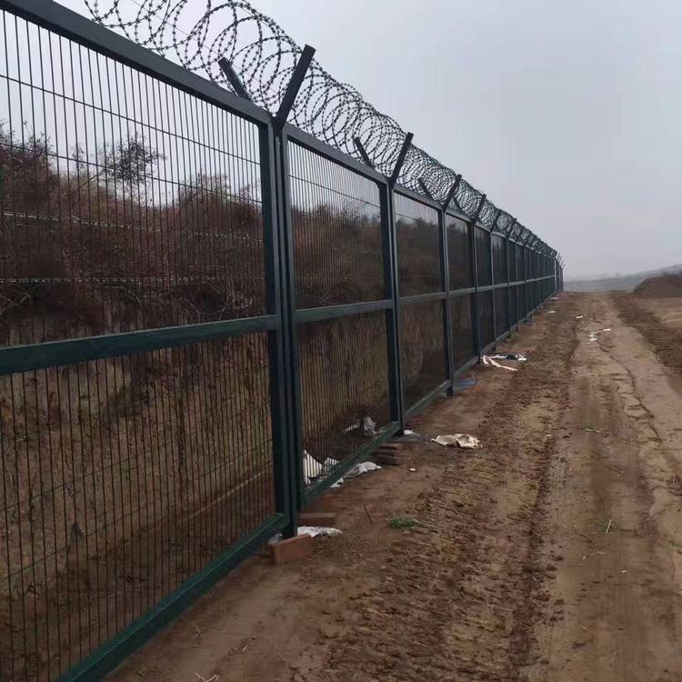 特點:如果在機場護欄網(wǎng)頂部加裝刀片刺絲、刀片刺繩后又很好的增強了安全防護性能。采用電鍍、熱鍍、噴塑、浸塑等防腐形式,具有很好的抗老化、抗曬、耐候等特點。其產(chǎn)品造型美觀、花色多樣,既起到圍欄作用,又起到美化作用。由于具有安全性高、防攀爬能力好,網(wǎng)片連接方式采用特制SBS緊扣件,有效防止人為的破壞性拆卸,橫向四道折彎加強筋,使網(wǎng)面強度顯著增加。