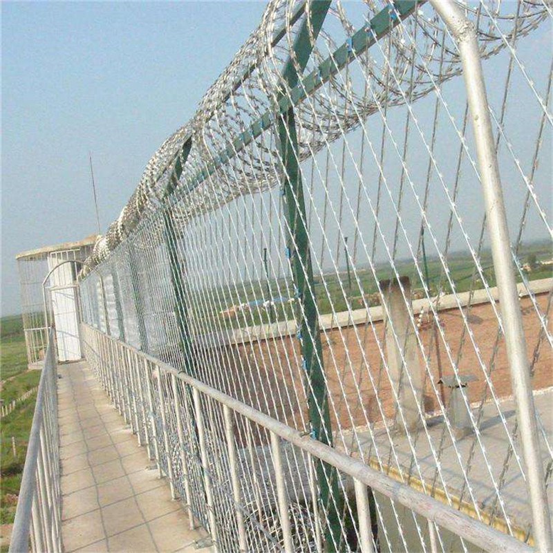 監(jiān)獄看守所鋼網(wǎng)墻 焊接刀片隔離網(wǎng)主要是采用高強度的刀片刺網(wǎng)與普通防護網(wǎng)的結(jié)合,由V型支架立柱,加強型焊接網(wǎng)片,安全防盜連接件和刀片刺網(wǎng)組成。刺網(wǎng)是一種新型護欄網(wǎng),由銳利尖角鍍鋅鋼板網(wǎng)或不銹鋼薄板做刀片,鋼絲做芯線組合而成的防護器材。主要材料規(guī)格:1.立柱:50mm*100mm*3mm表面為熱鍍鋅后浸塑。2.鋼網(wǎng)邊框:35mm*35mm*3mm表面為熱鍍鋅后浸塑。3.20mm*70mm*4mm表面為熱鍍鋅后靜電噴塑。